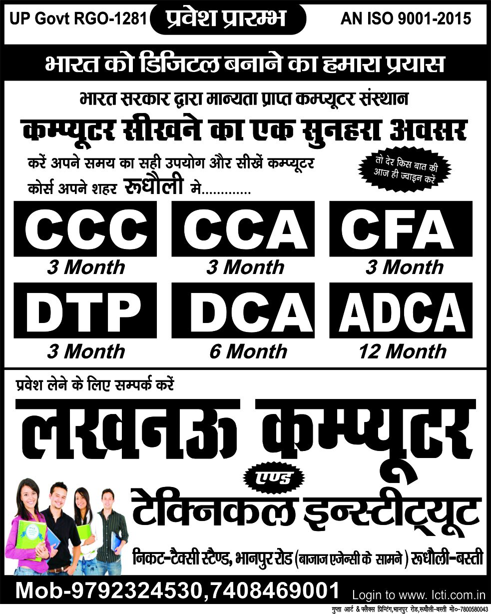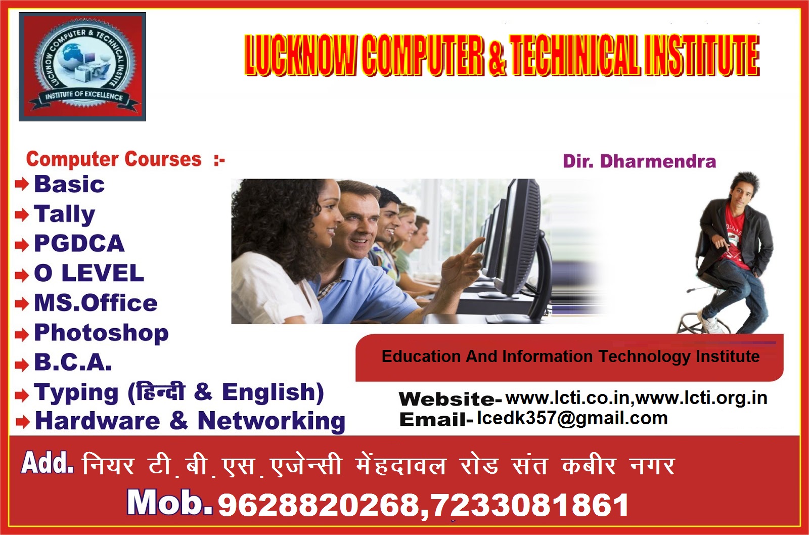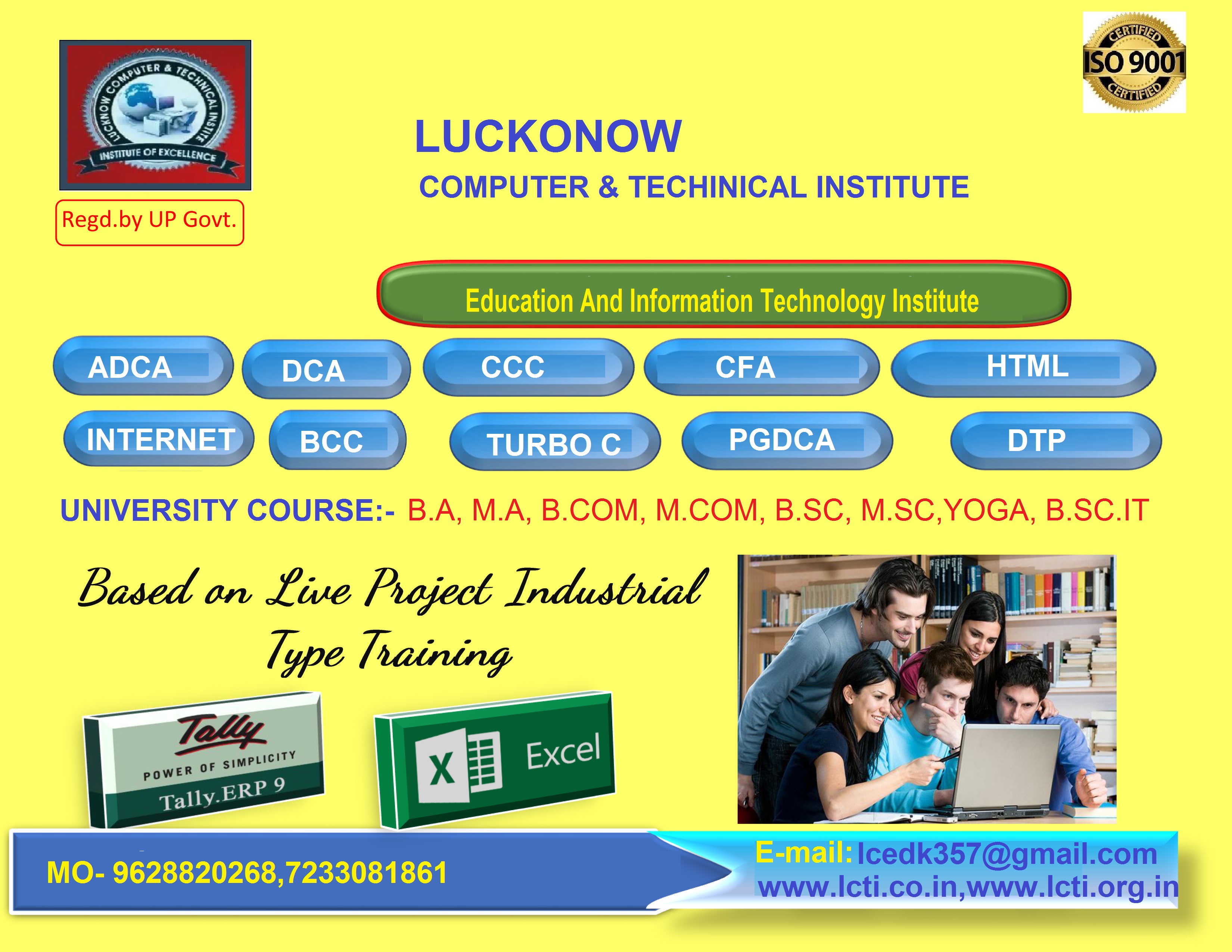 We are very much delighted, because you are considering the lucknow Computer & technical Institute is established in 2010 registered under the society act 1860 (Regd.No. 1281/2013/2014) by Government of Uttar Pradesh, and also Registered By ISO 9001-2015. Lucknow Computer& Technical Institute is working in different fields of Technical Training as Computer Software, Hardware, etc. Information Technology has become a fastest growing Industry in today's scenario which is providing thousands of job to well trained professionals.